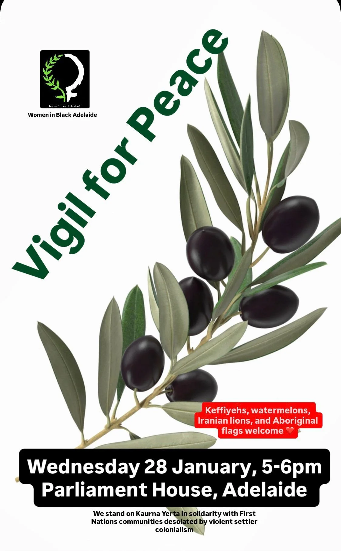 Join Women in Black at our regular silent vigil this Tuesday at Parliament House, Adelaide.