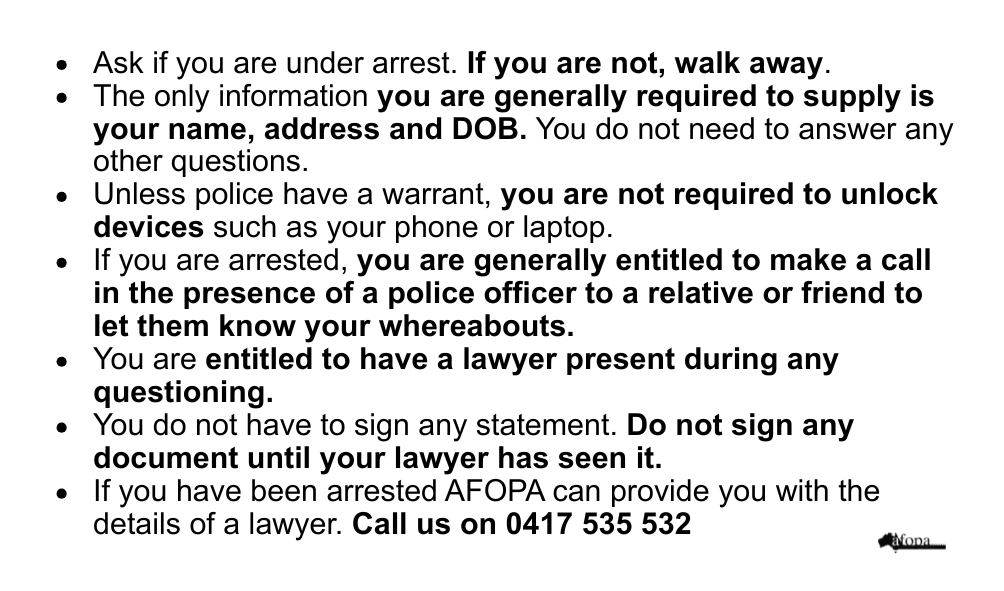If you or someone you know is arrested in South Australia in relation to Palestinian advocacy, please feel free to contact AFOPA on 0417 535 532 and we can connect you with a lawyer from our legal subcommittee.